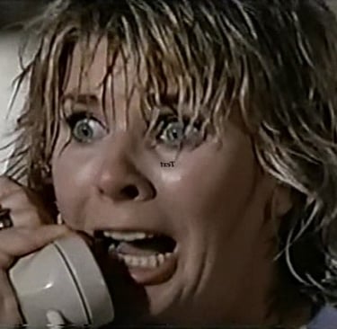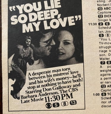 According to ME: Barbara Anderson reunites with Don Galloway (they co-starred on Ironside) for a nasty tale of a cheap, rich, silly lady who thinks her greedy and unfaithful husband whos’s cheating on her with a very young slut, is NOT trying to kill her. The righteous hagsploitative turban Barbara wears must've been too tight or else why couldn’t she spot the many clues portending treachery?